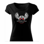 Pohodlné bavlnené dámske tričko „Moto klub helma“ s rukávmi kratšej dĺžky. Vypasovaný strih s bočnými švami perfektne zvýrazní Vašu ženskosť.